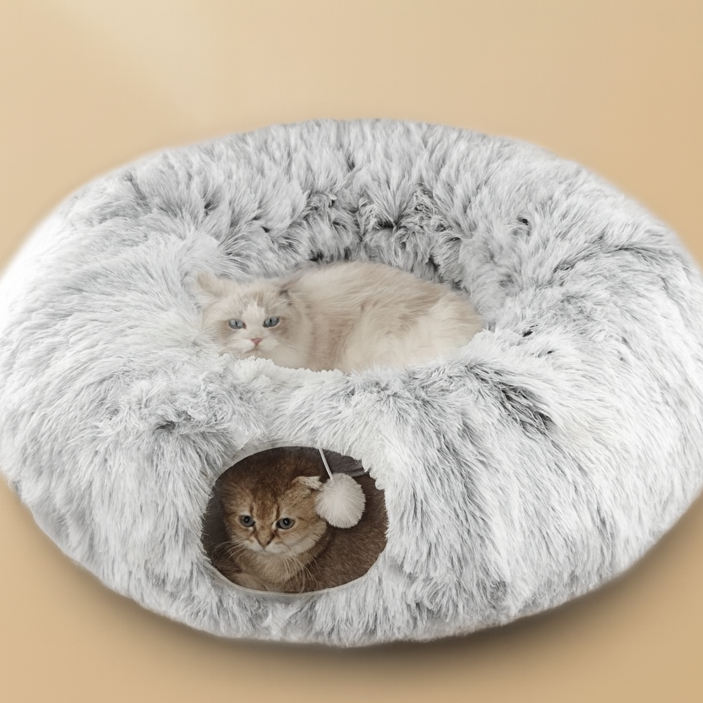 The Double-Layer Fluffy Cat Nest is designed to provide both comfort and functionality. Its two-level structure includes a soft sleeping area on top and a hideaway underneath, offering pets a warm and secure environment. The plush fabric ensures optimal comfort, while the round shape helps pets feel safe and relaxed. A built-in hanging ball adds a playful element to keep them entertained.