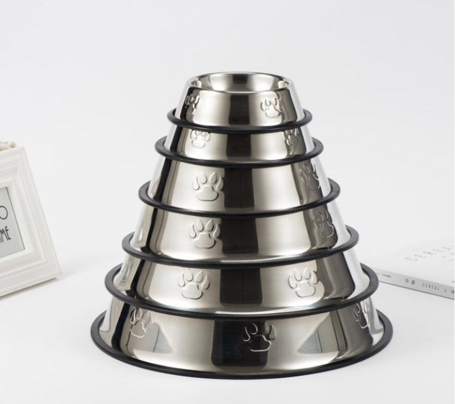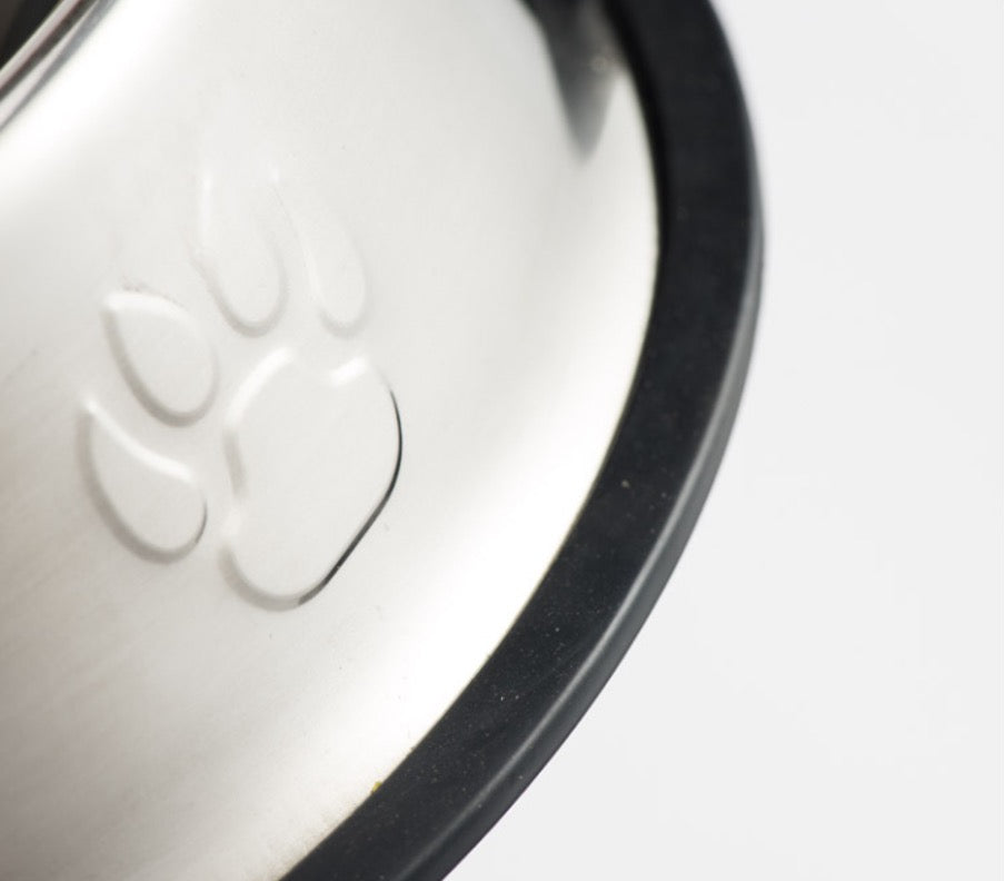 Unlike plastic bowls, stainless steel does not absorb odors or bacteria, helping maintain a cleaner and healthier feeding area. The smooth polished finish with subtle embossed paw-print details adds a simple, modern look, while the full non-slip rubber base keeps the bowl securely in place and prevents sliding or tipping during meals.
